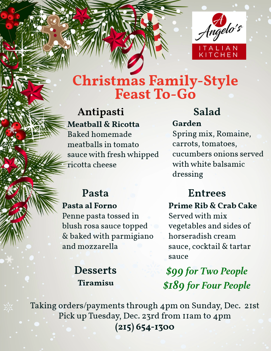 Please ask to speak with our managers or our chef. They will be delighted to help you plan an event at Angelo’s that will be a delicious experience for you and your guests.